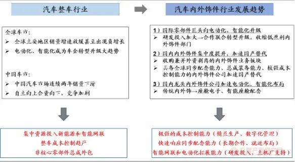 全球车市增速放缓甚至负增长,中国车市连年下跌。2020年全球乘用车新增注册量同比下降2.8%,其中欧洲地区同比下降0.3%,美国同比下降6.4%,日本同比微增0.1%。中国乘用车市场亦连续销量下滑,2020年同比下降6%。 2020年全球新乘用车注册量增速 资料来源:OICA 中国乘用车销量及增速 资料来源:中汽协 全球车企电动化、智能化转型大势所趋,需要持续大额研发投入。政策端,欧洲碳排放标准趋严、德国新能源补贴政策加码,中国智能汽车创新发展战略落地;产品端,特斯拉国产化引爆全球电动车市场,市值不断提升。主流车企早有布局,大众计划至2023年将在电动化转型上投入300亿欧元,丰田发布电动化发展战略, 明确了公司电动化发展路径。 分析判断,在全球汽车行业转型升级的大背景下,中国内外饰零部件企业迎来加速国产替代重要战略机遇期。 1)国际零部件巨头紧跟主机厂转型方向,内外饰部门主动收缩。国际零部件巨头为了保持新技术的垄断优势,需要紧跟主机厂的转型方向,加大在电动化、智能化核心零部件的研发和布局。 电动化、智能化需要持续大额的研发投入和大量的专业技术人员储备,为了维持公司整体的盈利水平,欧美零部件巨头开始主动收缩,剥离盈利能力和技术含量相对较低的内外饰件部门。中国内外饰零部件企业可以通过收购兼并等方式吸纳优质资产,获取海外资产、拓展海外客户。 我国主要内外饰零部件公司海外收购情况 资料来源:公开资料 2)主机厂集中资源转型升级,整车成本控制趋严,自主企业具备比较优势。分析认为,得益于相对较低的人工成本和较高的生产效率,我国内外饰零部件企业在成本控制方面具备比较优势,盈利能力高于海外零部件企业。 我们判断,随着精益生产、自动化生产等的不断推进和落实,我国内外饰件零部件企业有望在维持较高盈利能力的情况下加速国产替代。 分析认为,在全球车企电动化、智能化转型,国际零部件巨头主动收缩,整车成本控制趋严的大背景下,我国内外饰零部件想要实现突破需要具备以下三点能力。 1)极强的成本控制能力。精益化生产、数字化管理切实提高生产效率,能够在较低的毛利率天花板下谋求更高的净利率水平。 2)快速响应同步配套能力。长期与合资、优质自主主机厂进行同步配套,能够及时响应主机厂的要求,具备产品设计、模具设计能力。 3)智能化、电动化业务拓展能力。智能化、电动化是长期发展趋势,传统内外饰也是智能座舱、车身电子的重要组成部分,具备向智能化、电动化业务拓展的能力,提升行业毛利率天花板。 汽车内外饰行业发展趋势判断 据乘联会数据显示,预计2021年中国乘用车销售市场同比增长8%。依托于国家统筹疫情防控和经济发展的系列政策,宏观经济运行持续稳定恢复,成为中国汽车市场触底反弹的基石。 恰在此时,以中国、日本、韩国、澳大利亚、新西兰为首的15个国家共同签署区域全面经济伙伴关系(Regional Comprehensive Economic Partnership)协定,既标志着全球规模最大的自由贸易协定正式达成,也为深化区域经济一体化、稳定全球经济增添了一味强心剂。 中国汽车内外饰市场占尽“地利人和”,使我们不得不相信,2021年将会是中国汽车行业起飞的一年,汽车内外饰行业的长远发展将如有神助! 新冠疫情导致的消费者行为变化不会因为疫苗的发明而产生逆转,即使是传统巨头,也需通过结合互联网技术来制定未来发展战略。受疫情影响和产业转型升级的必然趋势,汽车“新四化”已经成为所有企业必须面对的紧迫问题。 这场全球性的流行病影响了诸多科技、制造行业的发展,加速了智能化、网联化,环保性、舒适安全、低成本,易回收等方面的应用。人们越来越关注个人健康、车内使用健康,以及家庭健康环境。