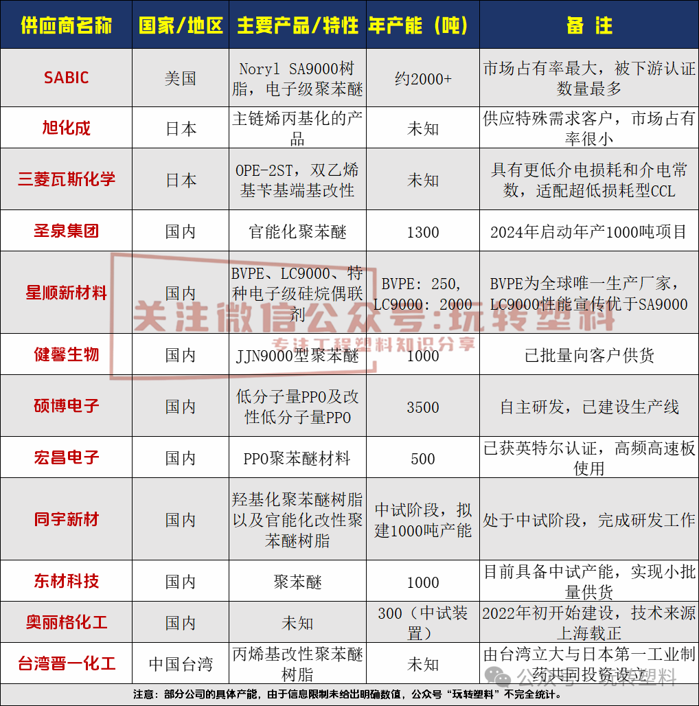 本以为小众的材料玩家不会太多,经过塑料君一段时间调研,玩家越来越多,亮点是国产厂商雨后春笋,势如破竹!国产的新建产能全部达产后,后续将占据着全球70%的产能,全球电子级PPO供应商,统计如下:
