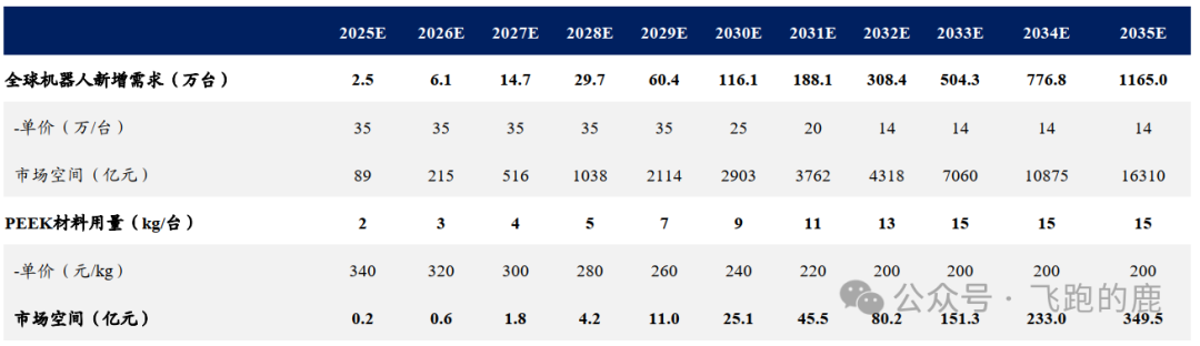 随着机器人销量增加,预计 2035 年机器人用 PEEK 材料的市场规模能到 350 亿元。有预测说,2025 到 2035 年,人形机器人新增需求可能从 2.5 万台涨到 1165 万台;同时,随着 PEEK 厂家产能释放,价格可能从每公斤 340 元降到 200 元,进一步提高 PEEK 的使用率,每台机器人的用量可能从 2 公斤逐步增加到 15 公斤。综合这些因素,到 2035 年,机器人用 PEEK 材料的市场规模或许能达到 350 亿元。