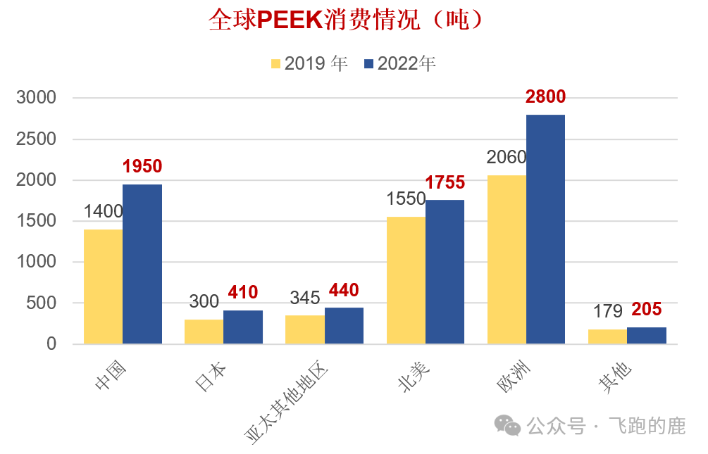 中研股份招股书显示,2019 到 2022 年全球 PEEK 消费量预计年均增 9%,从 5835 吨涨到 7556 吨。分地区看,欧洲、美洲和中国是主要消费地,22 年预计分别消费 2800、1755 和 1950 吨,占全球 37.0%、23.1% 和 25.8%。