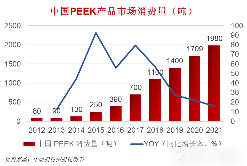 中国 PEEK 市场扩张很快,增速比全球平均高不少。受益于技术发展和产业升级,中国 PEEK 需求量从 2012 年的 80 吨涨到 2021 年的 1980 吨,这期间平均每年增长 42.84%,远高于全球平均水平。