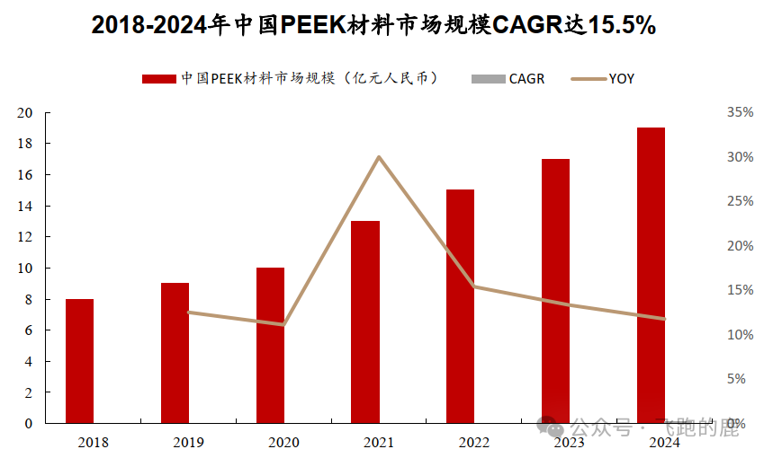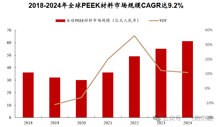 PEEK 材料行业发展稳,2024 年市场规模增速超 10%。技术进步和创新让 PEEK 性能、质量持续提升,成本不断下降,带动市场规模慢慢变大。全球市场方面,2024 年规模 61 亿元,比上一年增长 10.9%,2018 到 2024 年平均每年增长 9.2%。