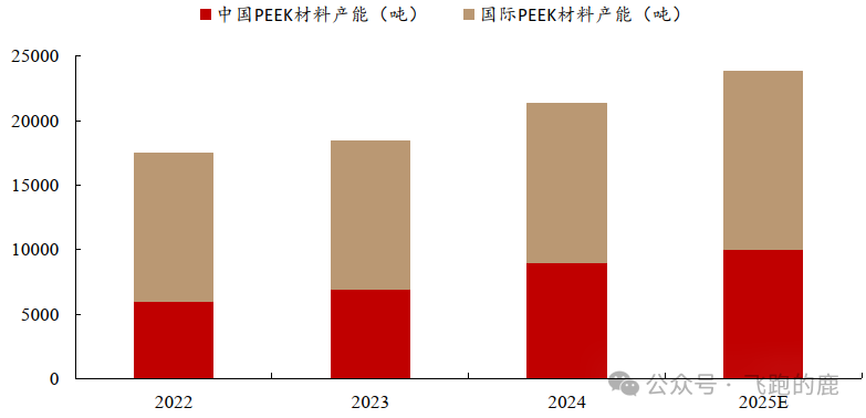 2021 年,中国在全球份额(1.4万吨)中占取了17.3%,到 2025 年,中国 PEEK 年产能将达 1 万吨,全球达 2.4 万吨,中国占比 42.0%。