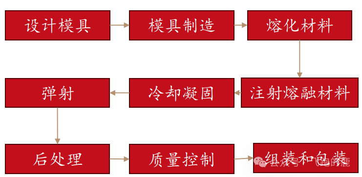 注塑流程至关重要,生产流程依次为:设计模具→制造模具→熔化材料→注射熔融材料→冷却凝固→弹射→后处理→质量控制→组装和包装,覆盖从模具开发到成品交付的核心环节。