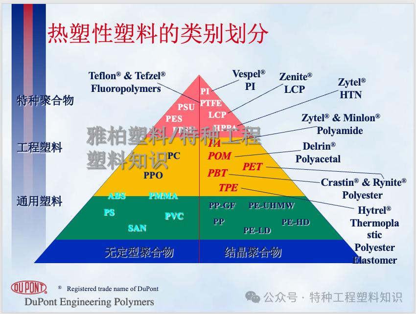 杜邦是尼龙改性的鼻祖,其他尼龙改性厂家都是他的徒弟,学得好的尼龙品牌有原来rhodia的technyl,很早在上海开了改性工厂,后来被solvay合并,再后来solvay觉得这个聚酰胺尼龙业务不赚钱是个垃圾业务,但是被basf看上,买了几个工厂过去。欧洲部分的solvay-ep的聚合改性和配方卖给了DOMO,TECHNYL品牌今年也72年了,现在的Domo道默的浙江嘉兴有开了新工厂,走精细化的尼龙改性路线,改性品类分的很细,走杜邦工程塑料20年前走的路;(杜邦2003年就在深圳搞万吨级的尼龙66改性,作者就是那个时候去杜邦工作的)笔者离开杜邦后和solvay合作搞项目+市场开发,后来笔者自己也和一家港资的老改性塑料工厂(成立48年了)合作搞各种尼龙改性,有如下几个产品品牌APEXNYL ,APEXPARA,APEXFLAM ,APEXHTNYL HPPA,等,2015年以来,做成了很多大项目。一般只会说我要原厂的某某型号,但是采购员其实并不知道化工原厂这款材料也是改性的。ZYTEL 101L就经过改性了。因为加了L这种润滑剂了。ZYTEL 70G33L 就是改性过的,改性手段是玻璃纤维增强+添加剂70G在杜邦命名系统表示是PA66-G是GLASS玻璃纤维的缩写,故名思议,改性就是在各种原材料树脂(英文resin)PA,PC,PBT,PET,POM,PPE,PPA,PPS.LCP,PEEK,PEI等resin树脂载体基础上,添加各种添加物改变材料的各种性能,
