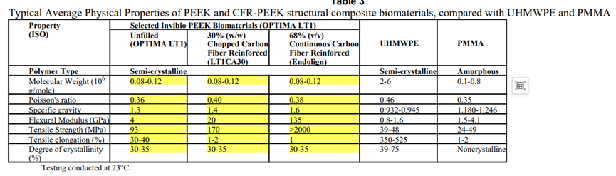 01 什么是CFR-PEEK? 02力学性能 在力学性能方面,CFR-PEEK的高强度使其能够承受较大的载荷,与人体皮质骨接近的弹性模量可以避免应力遮挡,提升早期愈合能力,此外,CFR-PEEK的耐磨性也使其能够长期保持稳定的性能,减少植入物磨损和碎屑产生的风险。这些特性使得CFR-PEEK在生物医学植入物中具有广泛的应用前景,特别是在需要承受高应力和负荷的场合,如创伤植入物。 03 生物相容性