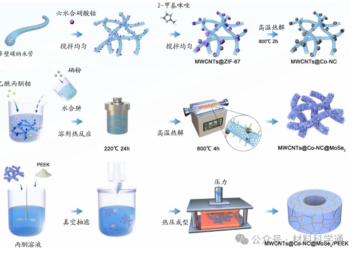 工艺优势:通过控制MWCNTs与二甲基咪唑钴的质量比(1:3.9~1:15.9)及溶剂热参数,可实现填料形貌与性能的精准调控。
