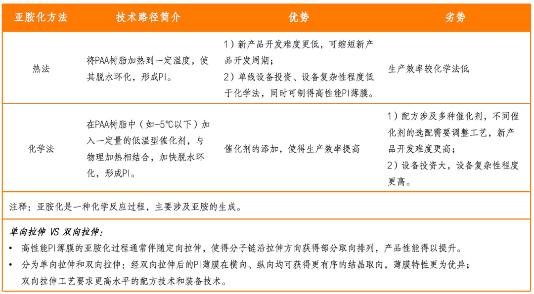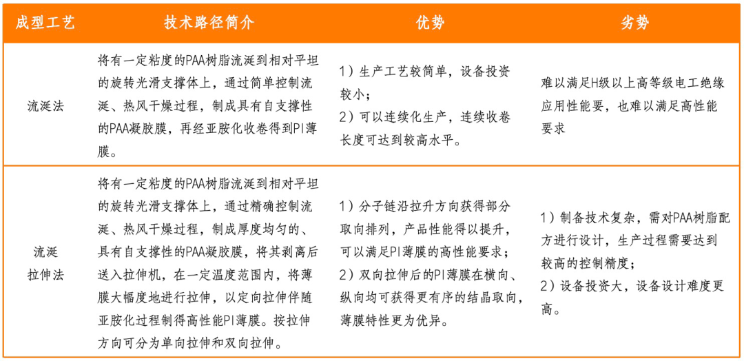 PI薄膜制备的技术路径主要有:合成方法(一步法/两步法)、成型工艺(流涎法/流涎拉伸法)和亚胺化方法(热法/化学法)等方面的区别。