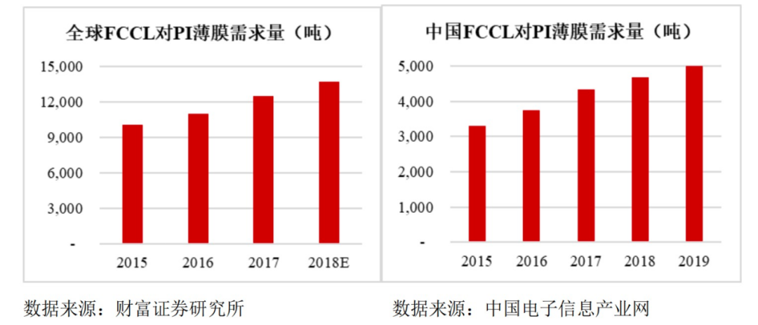 2017年,全球FCCL对于PI薄膜的需求从2011年的9000吨增长至12,500吨,复合增速5.6%。根据中国电子信息产业网数据,2019年中国FCCL用PI薄膜的需求量为5,020吨。