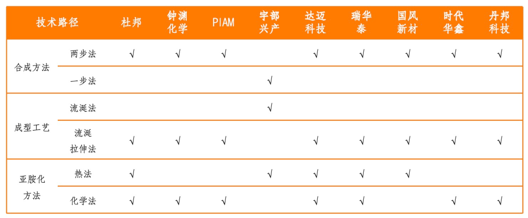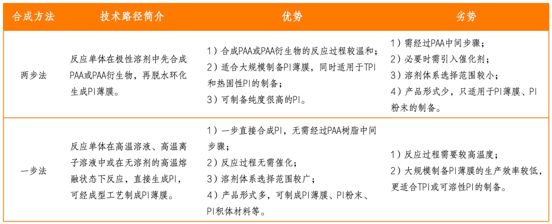 其中两步法最早由美国杜邦公司开发并使用,后续业内主要公司如钟渊化学、PIAM、达迈科技,以及我国厂家均采用此法。不同于此,日本宇部兴产采取了不同的技术路线,经一步法合成制备PI薄膜(无需经过PAA树脂中间步骤),其产品具有高耐热性、高尺寸稳定性和低吸湿性等优良性能,在微电子领域被广泛使用。