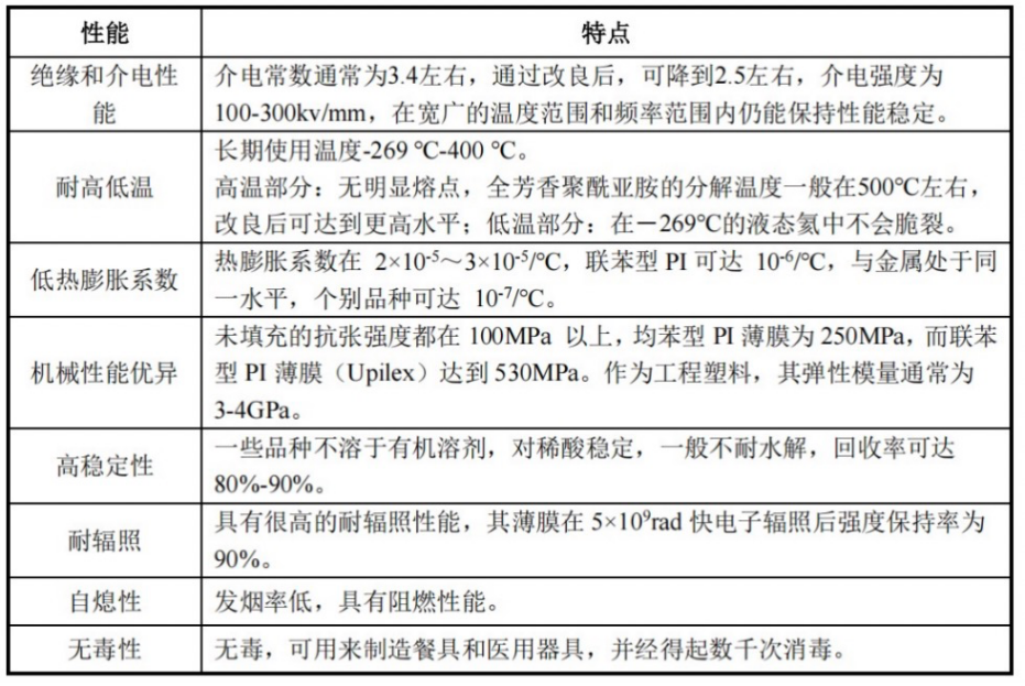 PI具有高绝缘强度、耐高低温、低热膨胀系数、耐辐照、阻燃自熄、高稳定性,以及良好的机械性能等特点,且在很宽的温度范围(零下269℃-400℃)内不会发生显著变化,被誉为“二十一世纪最有希望的工程塑料之一”。