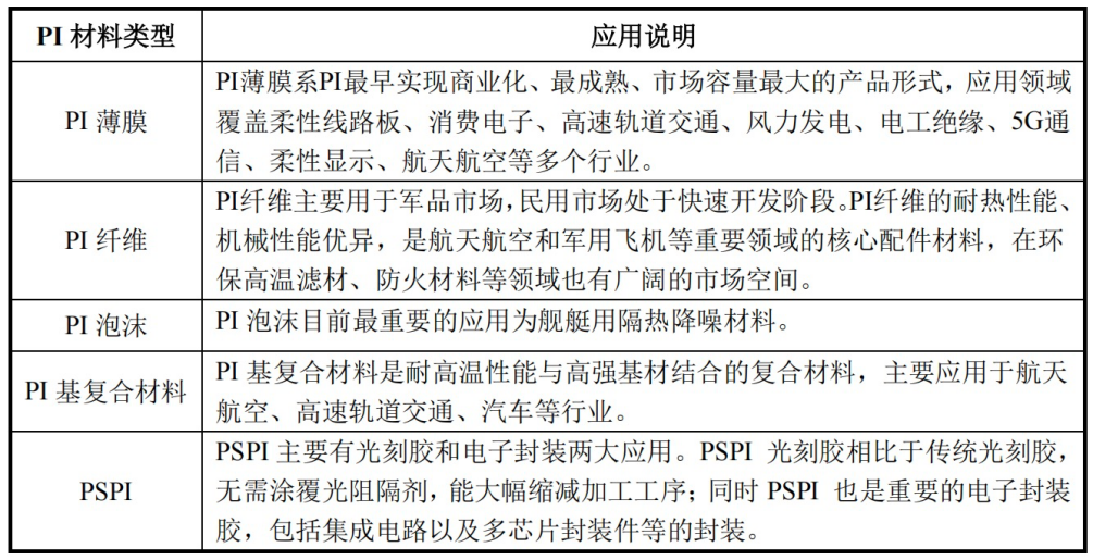 得益于优异的综合性能及出色的加工性能,PI可以制成除了橡胶以外的各种形式的产品,包括PI薄膜、PI纤维、PI泡沫、PI基复合材料、光敏PI(PSPI)等,产品类型的多样性在高分子材料中居于前列。