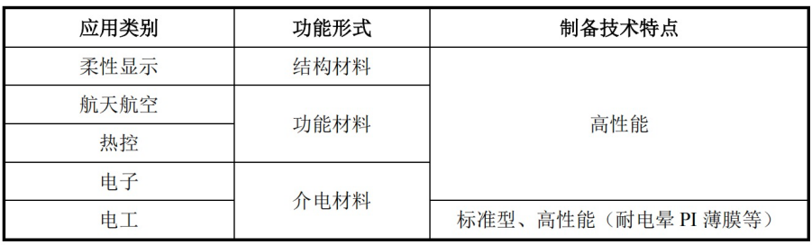 按应用类别,PI薄膜可分为:电工PI薄膜、电子PI薄膜、热控PI薄膜、航天航空用PI薄膜、柔性显示用CPI薄膜等。