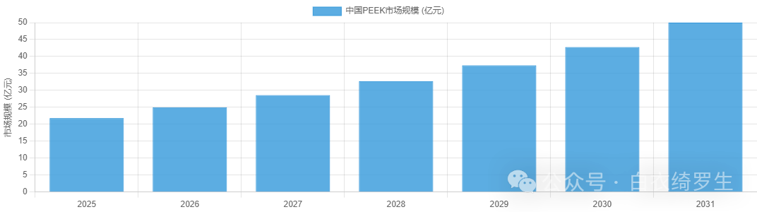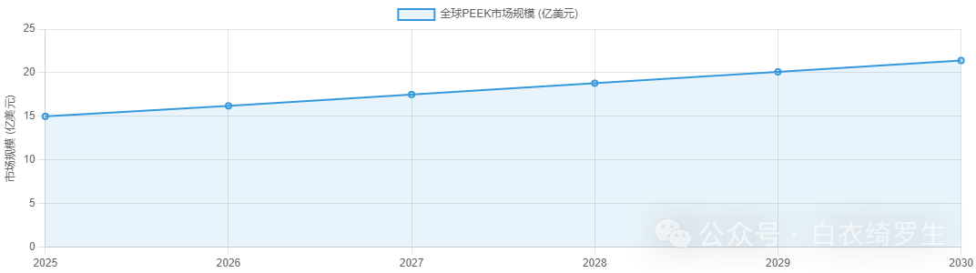 根据最新的市场研究数据,全球PEEK市场规模预计将从2025年的15亿美元增长到2030年的21.4亿美元,年复合增长率为7.5%。其中,机器人领域需求占比有望从目前的5%提升至20%。而中国市场增速更为显著,2025年规模预计达21.8亿元,2031年将突破50亿元,年复合增长率达14.4%。