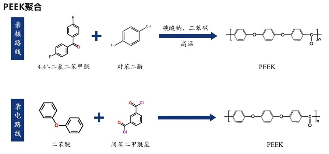 而若以合成机理对生产工艺进行分类的话,则可以分为亲核取代和亲电取代两类。其中亲电工艺采用以二苯醚和间苯二甲酞氯为原料的低温反应制备。其优点是条件温和、原料来源方便,但存在较多的聚合物支化、交联等副反应。如下图: