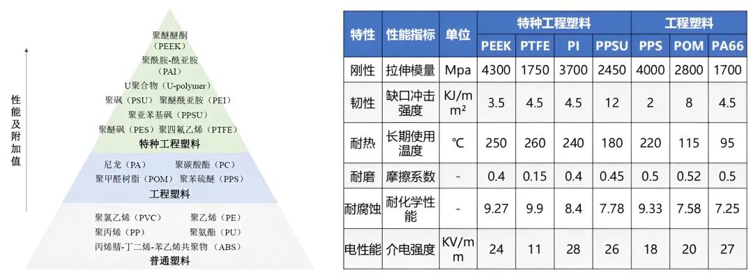 PEEK材料,即聚醚醚酮(Poly-ether-ether-ketone),是在主链结构中含有两个醚键和一个酮键的重复单元所构成的高聚物,属于特种工程塑料。与其他工程塑料相比,PEEK具有更加优异的高耐热性、热稳定性、机械性能、韧性、化学抗性、耐磨性和滑动性能,被誉为“工程塑料金字塔的皇冠”。