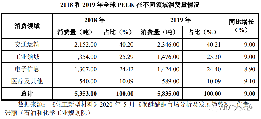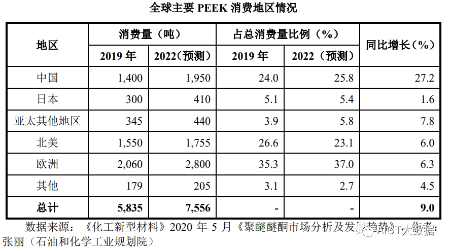 据公开信息,2012年PEEK消费量达到3,590吨,2019年全球消费量5,835吨,年均增长率7.19%,预计2019-2022年全球PEEK总需求量将以年均9.0%的增长率逐步增加,到2022年,PEEK材料的全球市场需求预计可达到7,560吨。