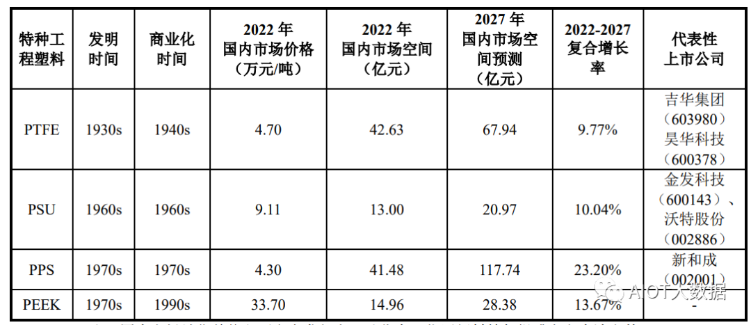 一种新材料应用范围的扩大和渗透率的提高需要一定的周期,目前被广泛应用的特种工程塑料,如聚四氟乙烯(PTFE)从发明到现在已经接近80年时间,PEEK自1978年研发成功后距今仅40多年,并且早期处于保密和垄断状态下。