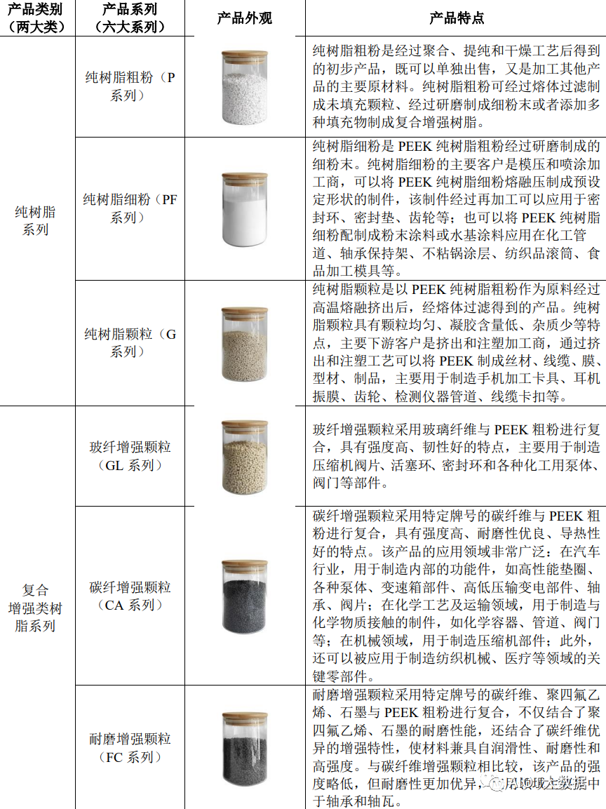 按照不同的表观形态及再加工方式分为纯树脂粗粉(P系列)、纯树脂细粉(PF系列)、纯树脂颗粒(G系列)、玻纤增强颗粒(GL系列)、碳纤增强颗粒(CA系列)、耐磨增强颗粒(FC系列)六大系列,适用于注塑、挤出、模压、喷涂等加工方式,可满足下游客户对PEEK的多种应用场景需要。