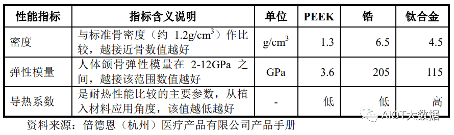 由于PEEK在密度、弹性模量方面与人体骨骼十分接近,正在快速替代部分医用金属。其与医用金属锆、钛合金性能指标对比情况如下: