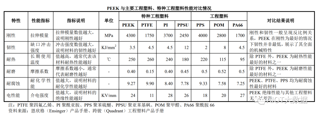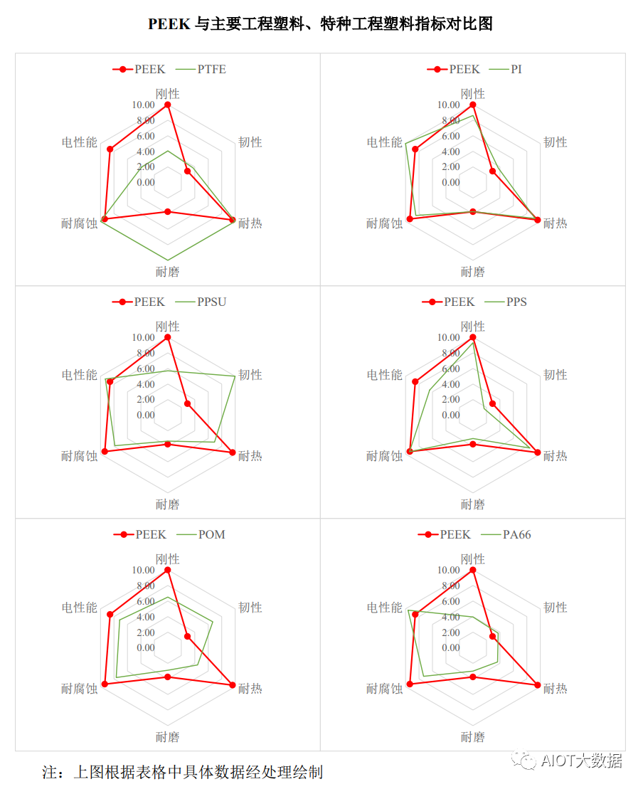 PEEK与主要工程塑料、特种工程塑料性能对比情况如下:
