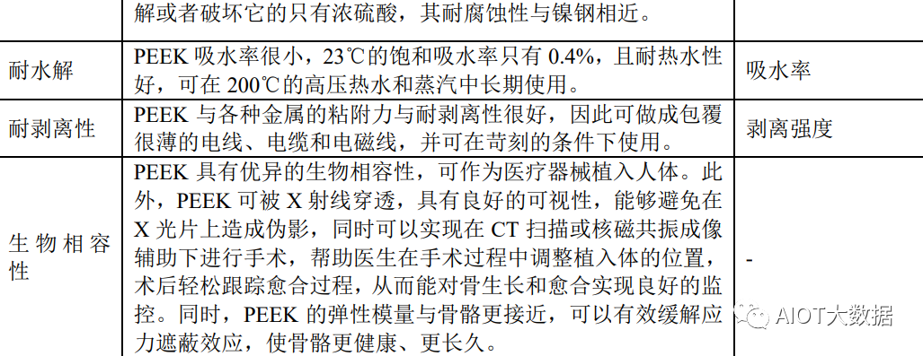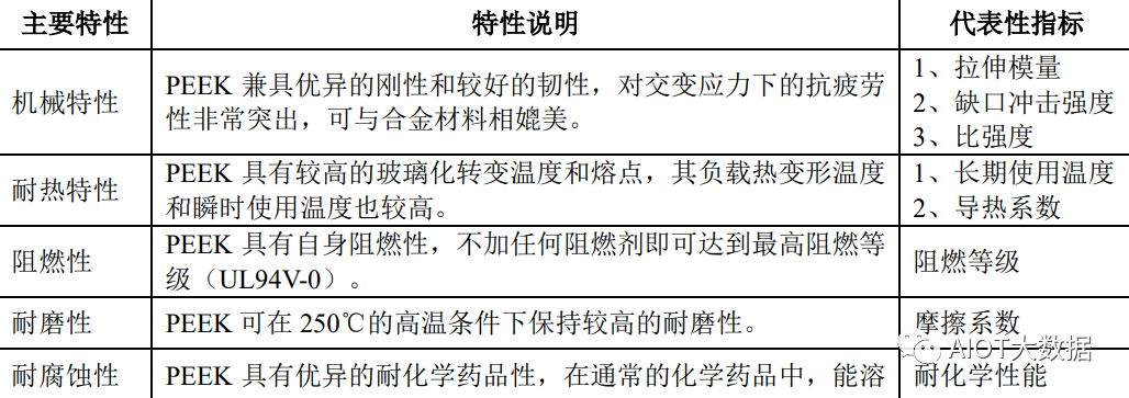 PEEK具有机械特性好、耐热等级高、耐腐蚀等特点,具体如下: