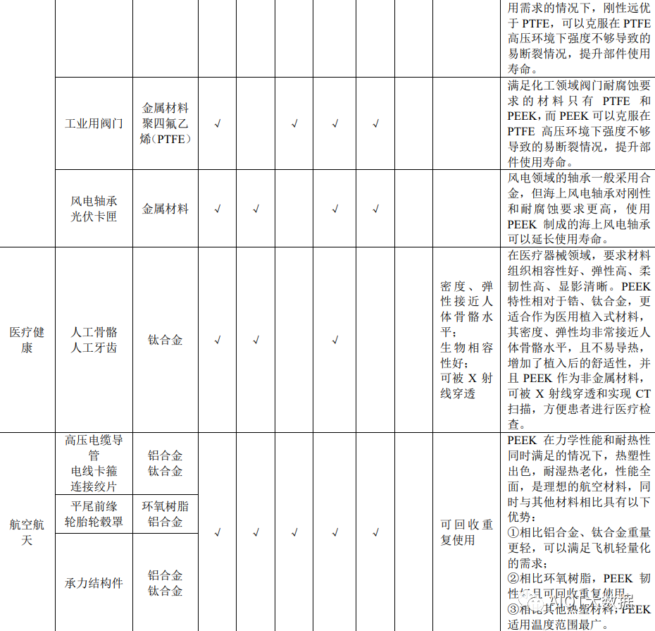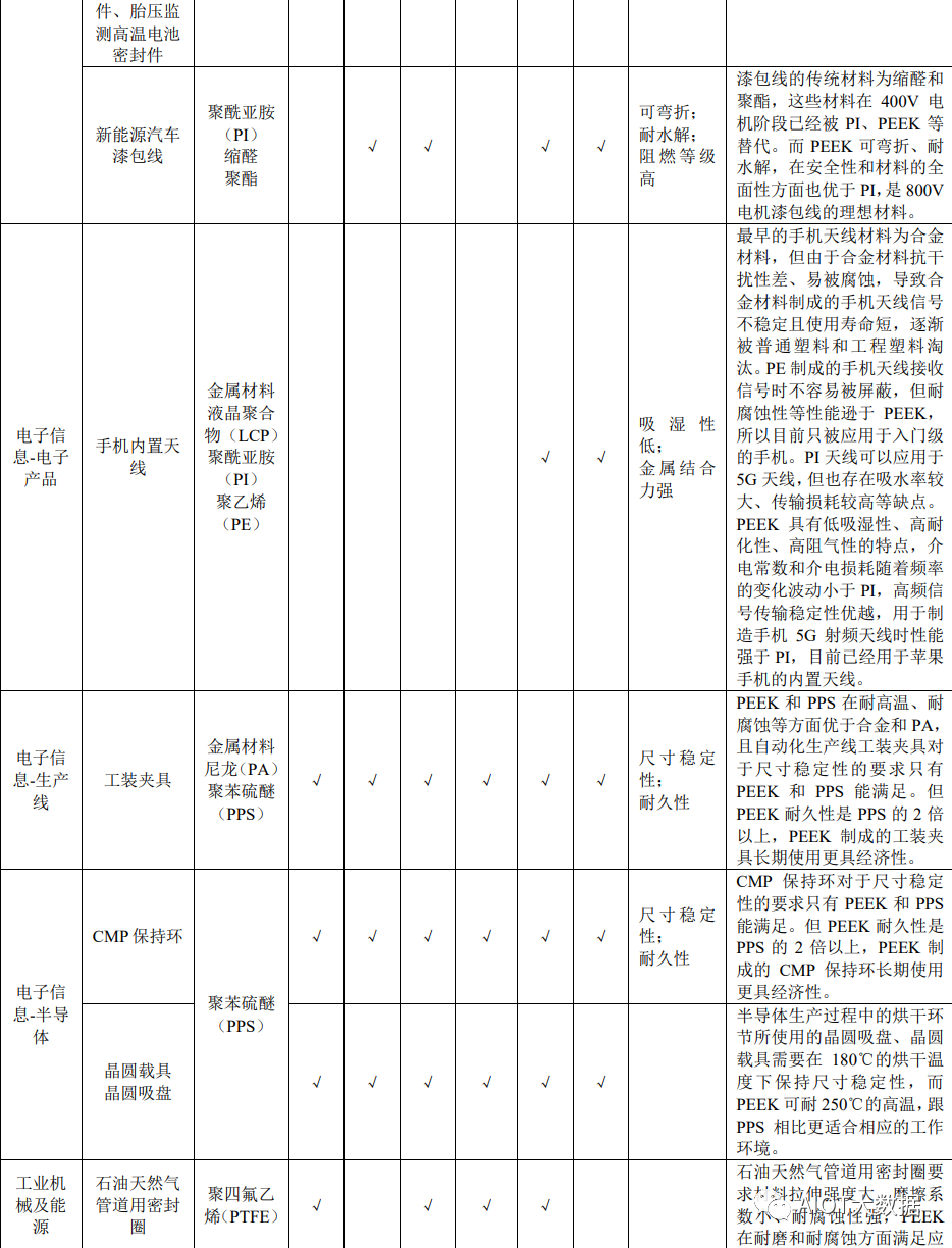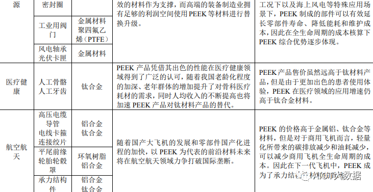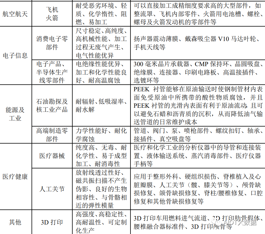 PEEK优异的综合性能使其在交通运输、航空航天、电子信息、能源及工业、医疗健康等多个领域得到广泛的应用,具体情况如下:
