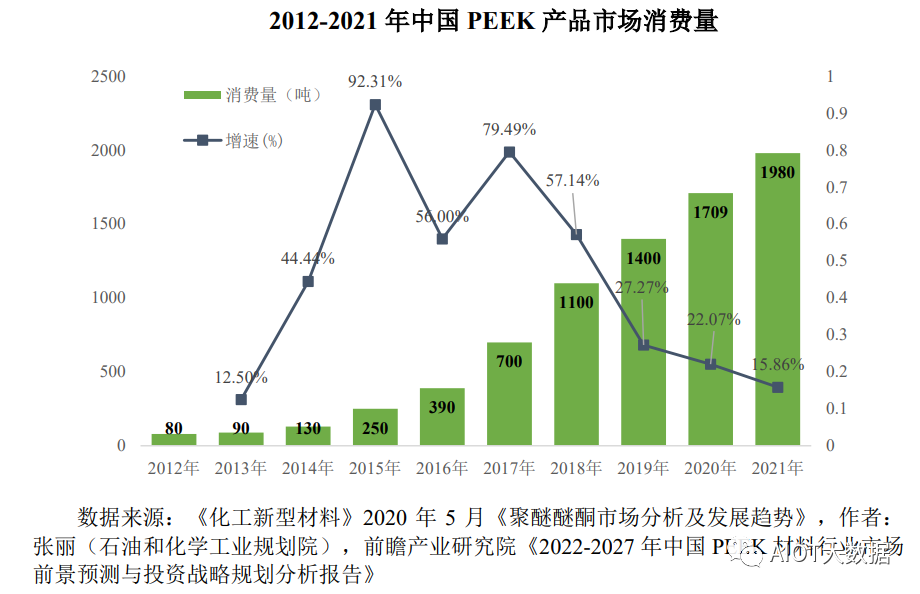 随着全球电子信息、汽车、航空航天产能不断向亚太地区转移,亚太地区的PEEK消费增长速度远超欧洲,尤其是中国PEEK市场增长迅猛。2012-2020年,中国PEEK产品需求量不断增加,从2012年的80吨增长至2021年的1,980吨,年均复合增长率达到42.84%,中国PEEK市场增速数倍于全球市场平均增速。