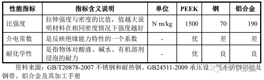 PEEK作为一种高分子新材料,其主要用于替代金属材料,在“以塑代钢”、“轻量化”的大背景下,PEEK以其优异的性能在中高端领域逐步替换金属材料的使用。其与通用金属钢、铝合金性能指标对比情况如下: