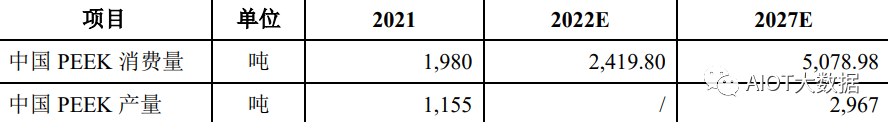 2021年,中国整体PEEK材料消费量为1,980吨,国内厂商实际产量约1,154.46吨,不能完全满足国内下游领域客户对PEEK材料消费需求,国内部分需求通过进口满足。目前,国内厂商在建产能包括浙江鹏孚隆、山东君昊高性能聚合物有限公司、盘锦伟英兴高性能材料、吉林省聚科高新材料有限公司、沃特股份等,合计在建产能为6,460吨,预计在2023年至2027年期间正式投产运行。