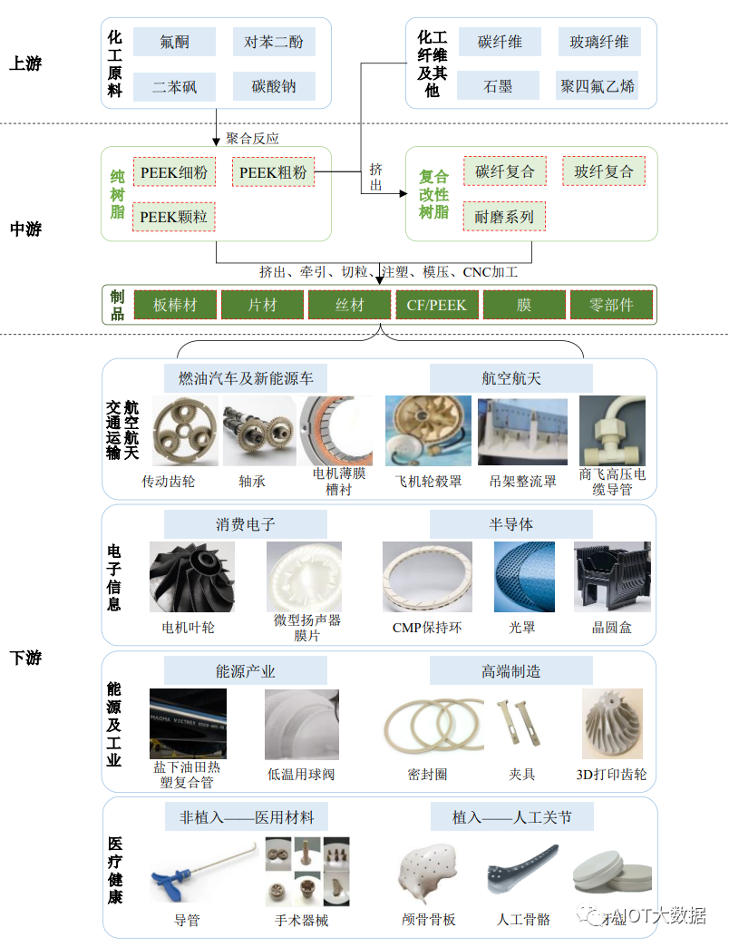 特种工程塑料是指综合性能优异的结构型聚合物材料,PEEK是一种新型的半晶态芳香族热塑性工程塑料,具有耐热等级高、耐辐射、耐腐蚀、尺寸稳定性好、电性能优良等不可替代的优异性能,是当今最热门的高性能工程塑料之一,产品产业链由以下环节构成: