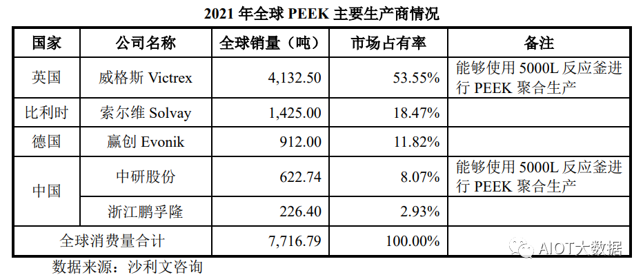 由于较高的技术壁垒,长期以来真正掌握PEEK高性能聚合物大规模工业稳产技术的企业很少,英国威格斯、比利时索尔维和德国赢创等三家公司几乎占据了全球绝大部分的市场份额,国内主要产能集中在中研股份和浙江鹏孚隆等少数企业。