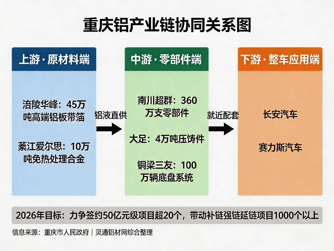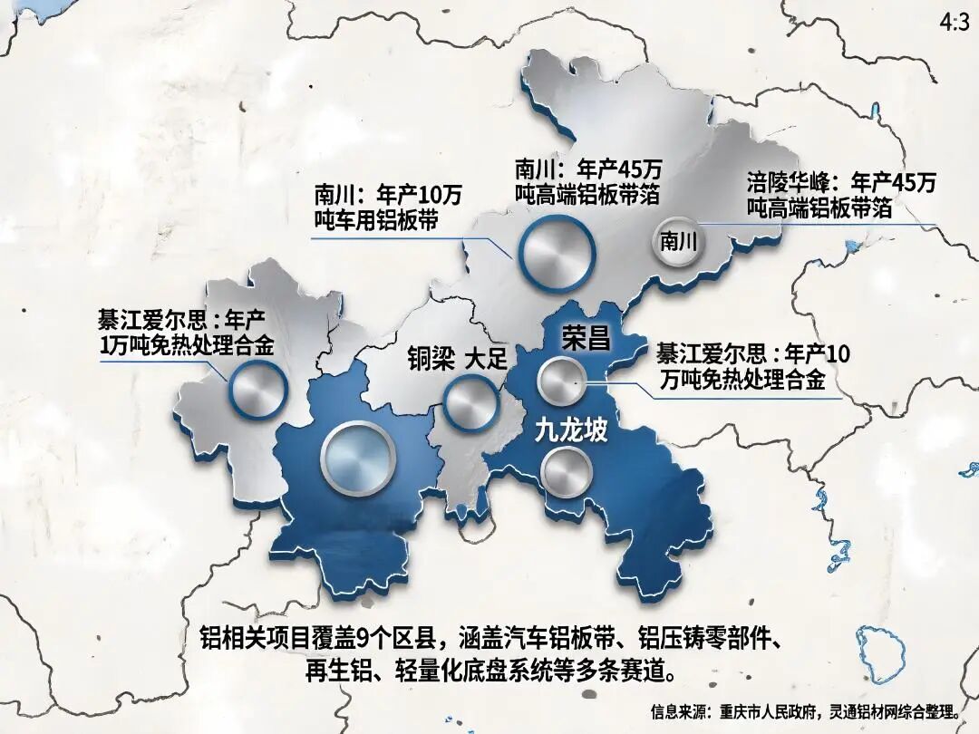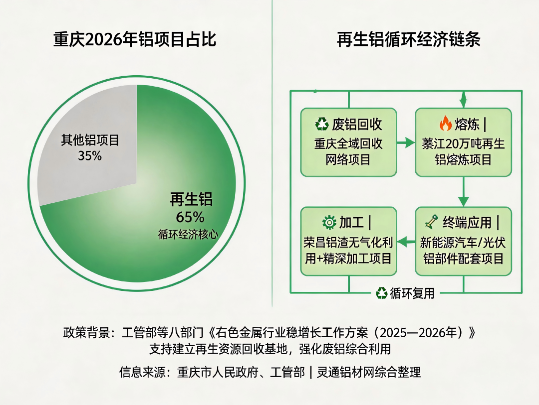 在这份清单中,多个项目直接对标汽车轻量化赛道,形成了从原材料到零部件的完整产业链条。南川区同时布局两个重点项目:年产10万吨车用铝板带项目,将新建厂房8万平方米,填补区域车用铝板带产能空白;超群轻量化铝合金汽车零部件智能工厂项目,建设年产360万支轻量化汽车零部件智能工厂。大足区年产4万吨新能源汽车铝压铸零部件产业园,将购置压铸机30台、加工中心100台,瞄准新能源汽车压铸件这一快速增长的市场。铜梁区三友未来年产100万辆新能源汽车轻量化底盘系统零部件项目,聚焦铝制转向节、控制臂及制动卡钳总成、制动器总成,直接切入底盘系统这一核心环节。在涪陵白涛工业园区,华峰年产45万吨高端铝板带箔项目正在扩建1套1+1+4连轧设备,建成后将年产45万吨复合高端铝板带箔,用于新能源汽车用电池、空调等外壳。重庆日报此前报道显示,该项目总投资26亿元,预计可新增产值100亿元,提供就业岗位近800个。在九龙坡,西南铝产能提升项目建设20万吨循环经济项目、高性能特种环件生产线、2.5万吨大规格挤压生产线及宽幅板带线等多个子项目,持续巩固其在航空航天及高端工业铝材领域的领先地位。轻量化赛道的增长逻辑,建立在清晰的数据基础之上。纯电车型对续航里程的极致追求,使其对轻量化铝材的依赖远超传统燃油车。据行业数据显示,2026年新能源汽车单车用铝量已达230至310千克,同比提升52%,而传统燃油车仅为110至130千克。一辆电动车平均比燃油车多使用约150磅铝材。按照中国汽车工程学会发布的《节能与新能源汽车技术路线图》,到2030年中国汽车应实现减重40%,单车用铝量大于350千克。全球铸铝汽车零件市场预计将从2025年的312.7亿美元增长到2026年的334.1亿美元,复合年增长率6.8%。重庆正在用项目布局回应这一趋势。在綦江,轻量化材料的布局更为系统。綦江高端铝合金生产项目,建设研发中心、高端铝棒熔铸线、智能化挤压生产线及铝合金材料生产线压铸车间、机加车间等。爱尔思(交大)免热处理合金及汽车零部件生产基地项目,一期建设年产10万吨免热处理车用合金材料生产线;二期建设200万件铝制品压铸、加工生产线。2025年3月该项目已正式开工,总投资25亿元。免热处理合金是一体化压铸的关键材料,其市场空间正在被特斯拉引领的一体化压铸浪潮快速打开。国泰君安证券研报指出,随着一体化压铸技术成熟,我国铝型材市场存在较大空间,新能源汽车2026年一体化压铸规模有望超300亿元。綦江目前正聚力打造重庆市智能网联新能源汽车轻量化材料基地,已逐步构建起覆盖电解铝、再生铝、铝基材到轻量化零部件的完整产业体系,形成年产能34万吨电解铝、29万吨再生铝、40万吨高品质铝基材及1000万套汽车轻量化零部件的生产能力,集聚美利信、新铝时代等30家上下游企业,并创新推行“铝液直供”模式,有效帮助产业链企业降低生产成本超15%。再生铝项目的密集布局,同样是这份清单的显著特征。已公示项目中,再生铝项目占比超过60%,反映出重庆铝产业向绿色低碳转型的明确导向。綦江年产20万吨再生铝及精密加工项目,将同步引进铸造及精密加工等配套企业。荣昌年产20万吨再生铝、10万吨铝渣无害化利用及智能环保设备生产基地项目,总建筑面积约9万平方米,建设3条再生铝生产线、2条铝渣无害化利用生产线。黔江铜铝再生资源综合利用项目,形成年产再生铝加工产品20万吨、再生铜加工产品15万吨的生产规模。开州万达开先进制造产业园再生铝等新材料集群发展项目,建设再生铝、铝制汽车零部件、新型预制电缆管等产业链项目。此外,垫江县2026年一季度签约项目中,年产5万吨再生铝及铝制品加工项目拟建设10条精深加工生产线,投产后预计年产值12.5亿元。这一布局的背后,是国家政策对循环经济的有力引导。工信部等八部门印发的《有色金属行业稳增长工作方案(2025—2026年)》明确提出,支持有条件的地区建立再生资源回收基地,强化废铜、废铝等废有色金属综合利用。重庆不仅在项目层面响应政策,在机制层面同样先行先试。2026年2月,全国首个“江海联运”进口再生铝原料检验监管模式优化试点正式在重庆永川落地。重庆永川区是重庆现代制造业重要承载地,铸造铝合金是当地汽车、电动车等支柱产业的核心配套,而再生铝作为其主要原材料,2025年缺口超20万吨。该试点的落地,有效打通了进口再生铝原料的物流瓶颈,为本地铝加工企业的原料保障提供了新通道。重庆铝产业链的构建,还与本地整车企业的协同发展深度绑定。在合川工业园区,总投资20亿元的汽车零部件总部基地项目加快建设,项目聚焦车身总成、新能源电池包等核心部件,建成后将为长安、赛力斯等链主企业就近配套,带动上下游协同发展。从产业链视角看,上游铝材的稳定供应与下游整车制造的需求释放形成正反馈循环。2026年3月,中铝高端携全系列高端汽车用铝核心产品亮相重庆智电汽车科技与供应链展览会,其汽车板产品已通过20余家主机厂认证,并深度融入新能源汽车产业链。这种“材料企业—零部件企业—整车企业”的协同模式,正在为重庆打造世界级智能网联新能源汽车产业集群提供基础材料保障。对于铝门窗行业而言,上游铝材供应格局的变化同样值得关注。当头部铝加工企业将产能更多配置于高附加值的汽车轻量化领